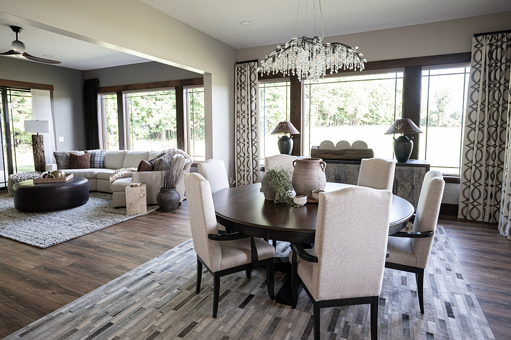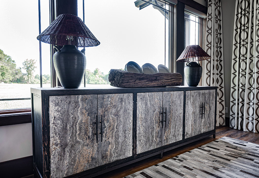 With enough seating for eight, this solid mahogany table features timeless design and exceptional quality. Paired with performance fabric dining chairs and an oversized sideboard with travertine doors, the room offers both function and a rustic elegance. We added visual highlights from top to bottom with a crystal branch inspired chandelier and patched hair on hide rug. Oversized pottery, a custom wood buffet bowl and woven shade table lamps provide the finishing details for the space.