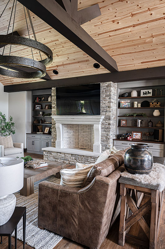 With this great room, we wanted to create a cozy ambiance with a rustic lodge design. The wood vaulted ceiling, barn beams, and dramatic oversized metal chandeliers draw you into the room providing texture and visual interest. The center of the room showcases a stone fireplace with a custom limestone mantelpiece and backlit builtins with wood shelving and countertop. For the furniture we selected two leather reclining sofas in a rich brown as well as two neutral swivel gliders and an oversized coffee table. We added a stone top architectural base console table at the back of one of the sofas so it is a highlight as you enter the home. A highly textured rug, metal tones, and supple leather are combined with touches of greenery, handmade pottery, and natural wood accents.