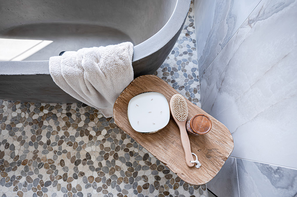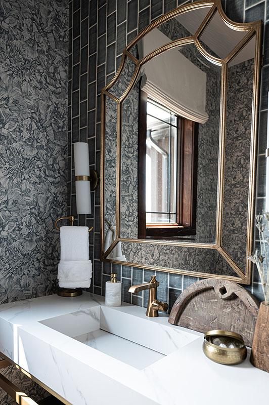 Providing a serendipitous mix of charm and glamor, this powder room showcases a textured tile accent wall paired with a delicate fine line floral wallpaper. The smokey blue color palette contrasts beautifully with the marble vanity and brushed gold accents. Warmth was added to the space using rustic woods accessories, deep stained trim and dried star flower stems.