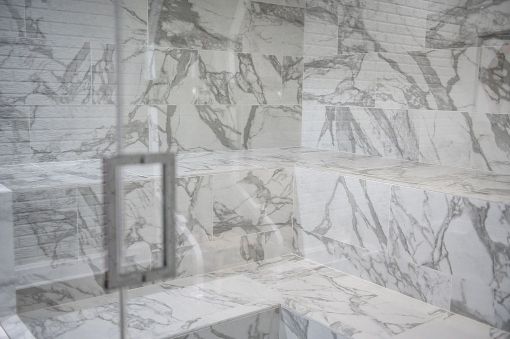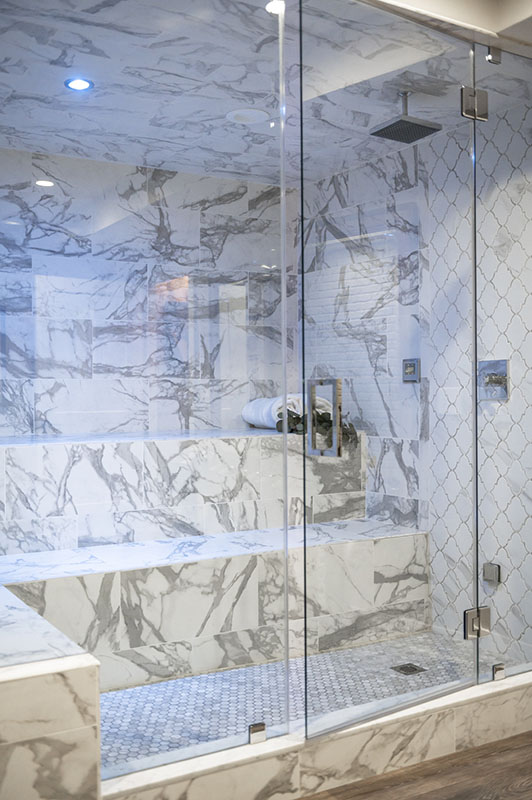 Step into a sanctuary of refined luxury where timeless materials and modern elegance converge. Beautiful veined marble wraps the shower walls and tub surround, creating a serene yet sophisticated foundation. Warm wood stains and luxe brass hardware are peppered throughout the space.