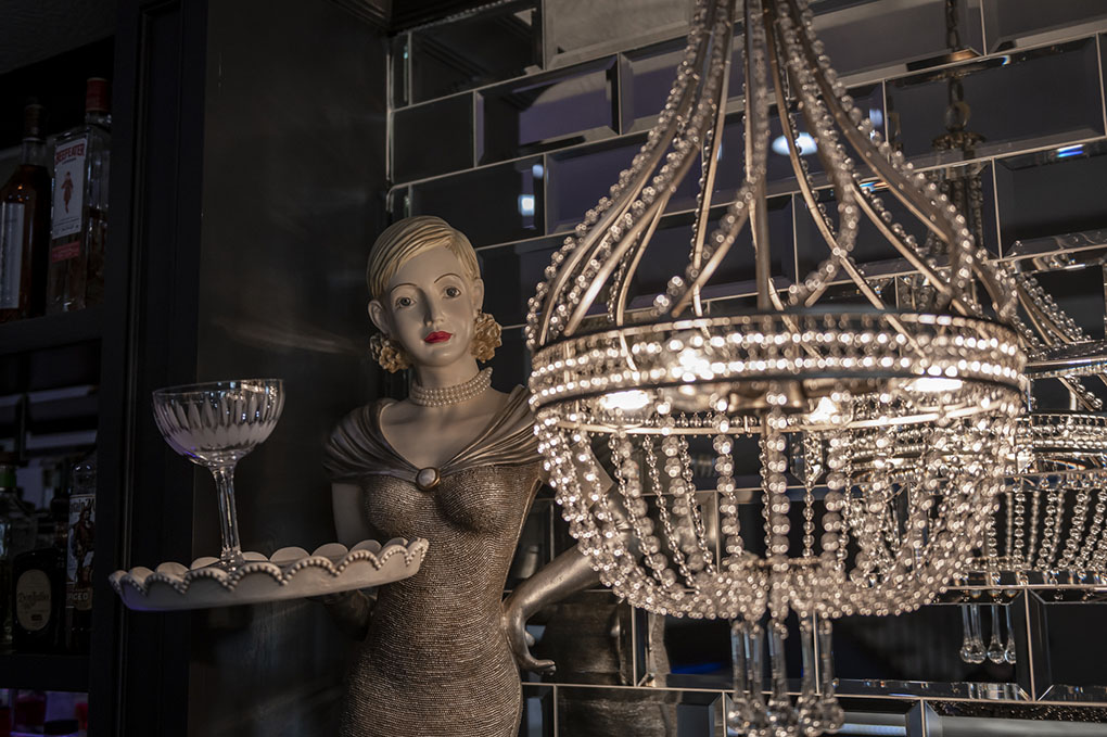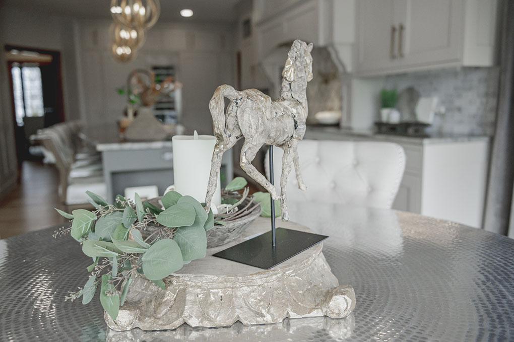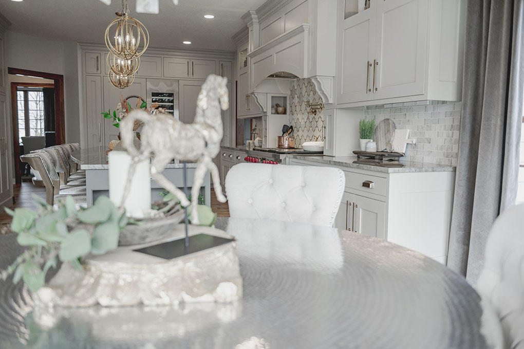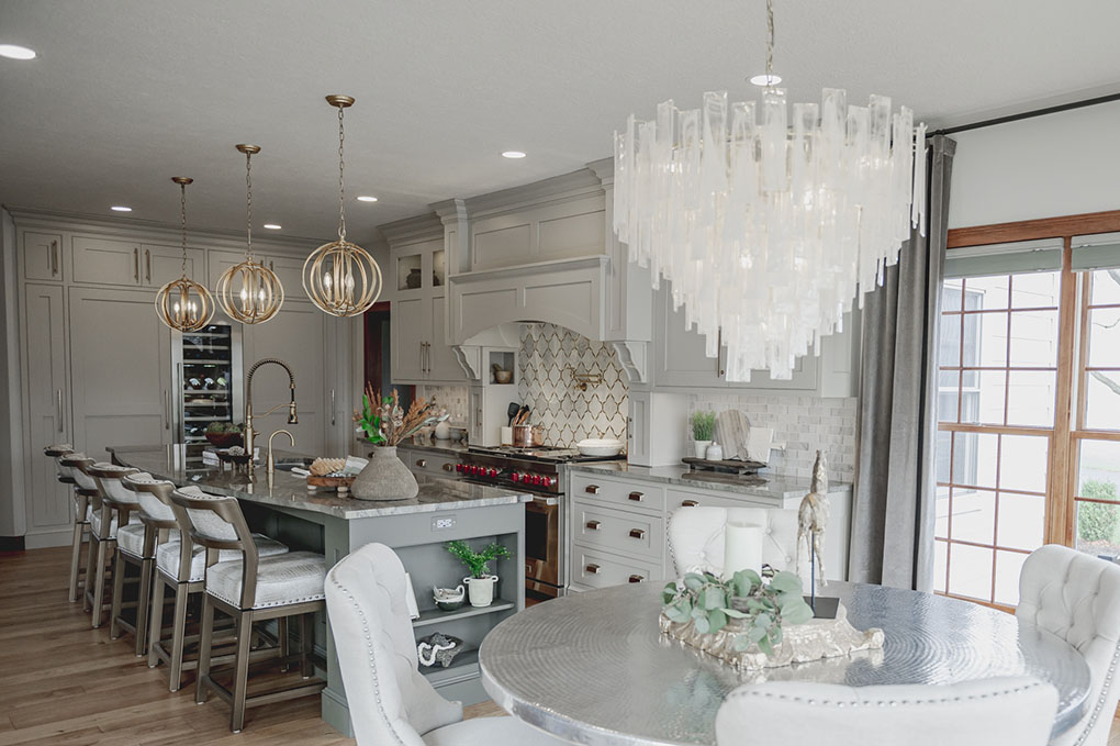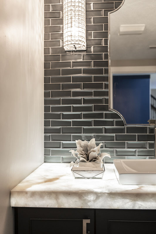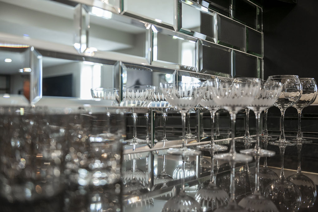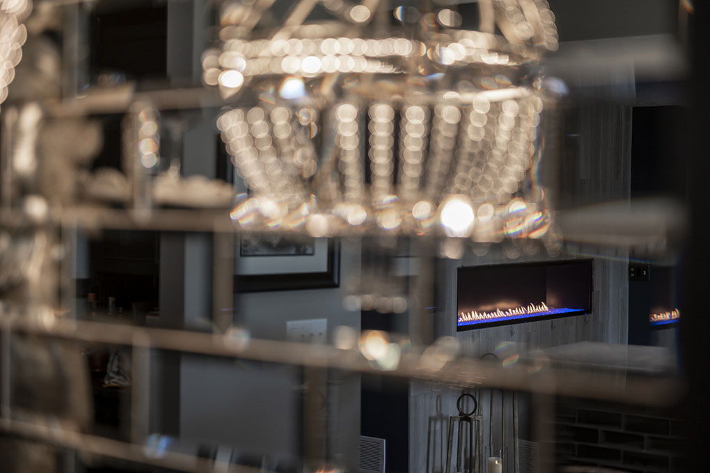 From studs to stunning. Kellyann’s clients had completely gutted their large basement to create an entertainment oasis filled with all of their favorite things. Inspired by the Rat Pack and glamor of Las Vegas, she transformed the bar into a luxurious lounge, complete with a beveled mirror backsplash, Art Deco inspired chandelier and an illuminated quartzite countertop to add the perfect touch of swanky uniqueness.
