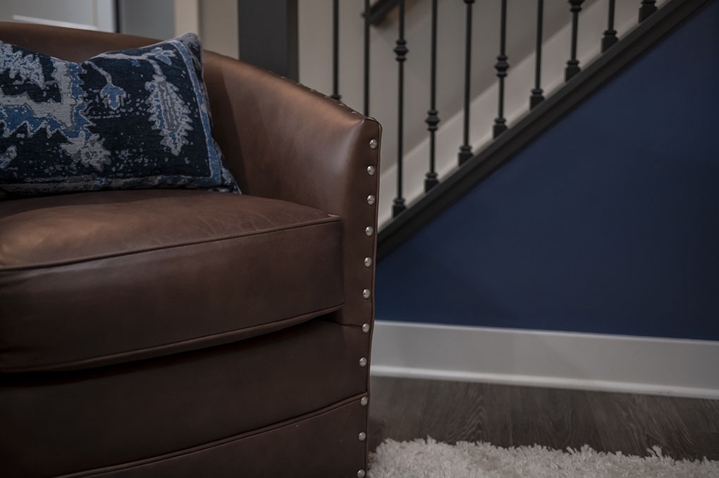 Below, the basement unfolds as a moody, glamorous escape—complete with a Rat pack–inspired bar, leather textures, and an intimate music studio showcasing the client’s passion for the blues. Every space reflects Kellyann’s talent for crafting environments that balance modern elegance with personality and purpose.