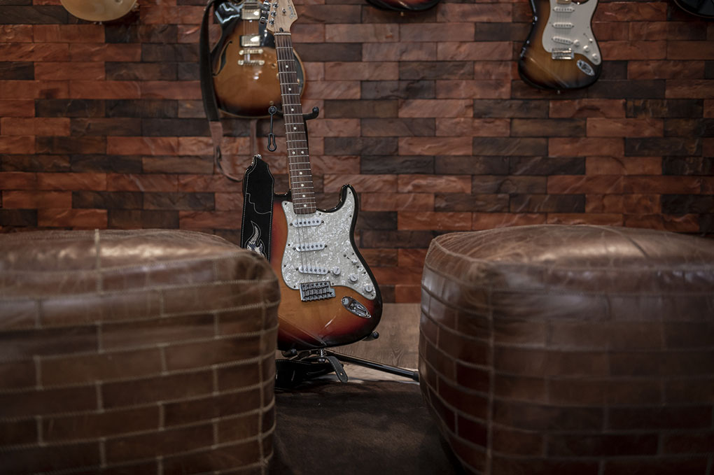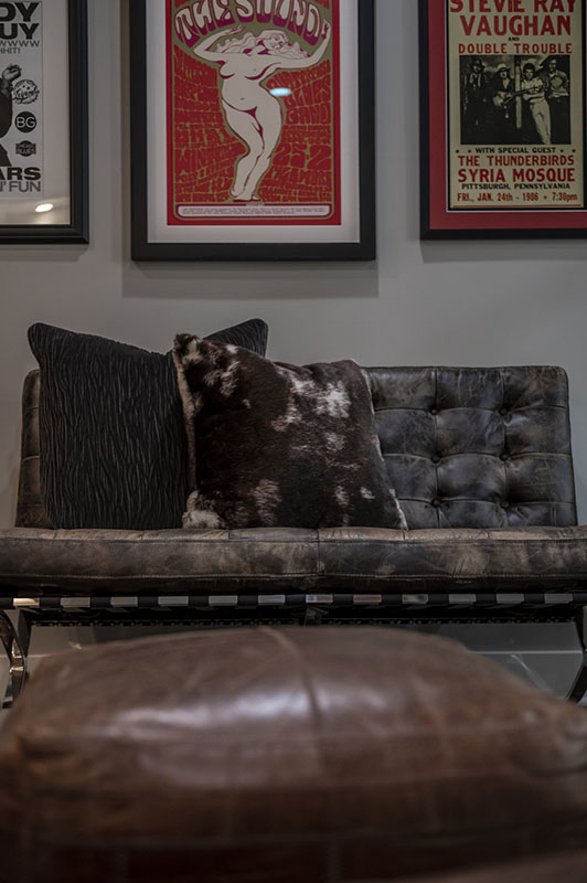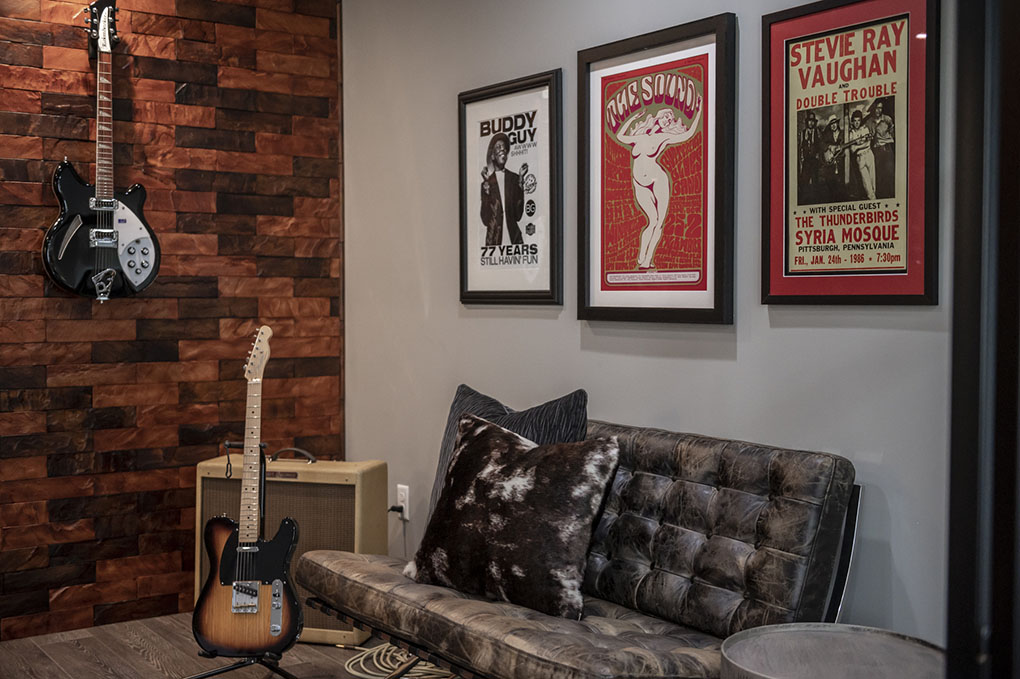 From studs to stunning. Kellyann’s clients had completely gutted their large basement to create an entertainment oasis filled with all of their favorite things. The music room is an ode to her client’s love of the blues and his vast guitar collection. In keeping with the moody and luxe theme, Kellyann covered the accent wall in leather wrapped tile to create a rich and dimensional backdrop for the beautiful instruments. This, paired with leather seating, cowhide rugs and wall to wall metal and glass French doors, created a perfect harmonious hideaway.