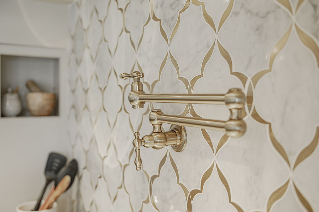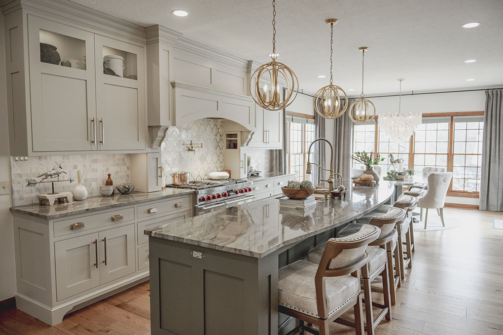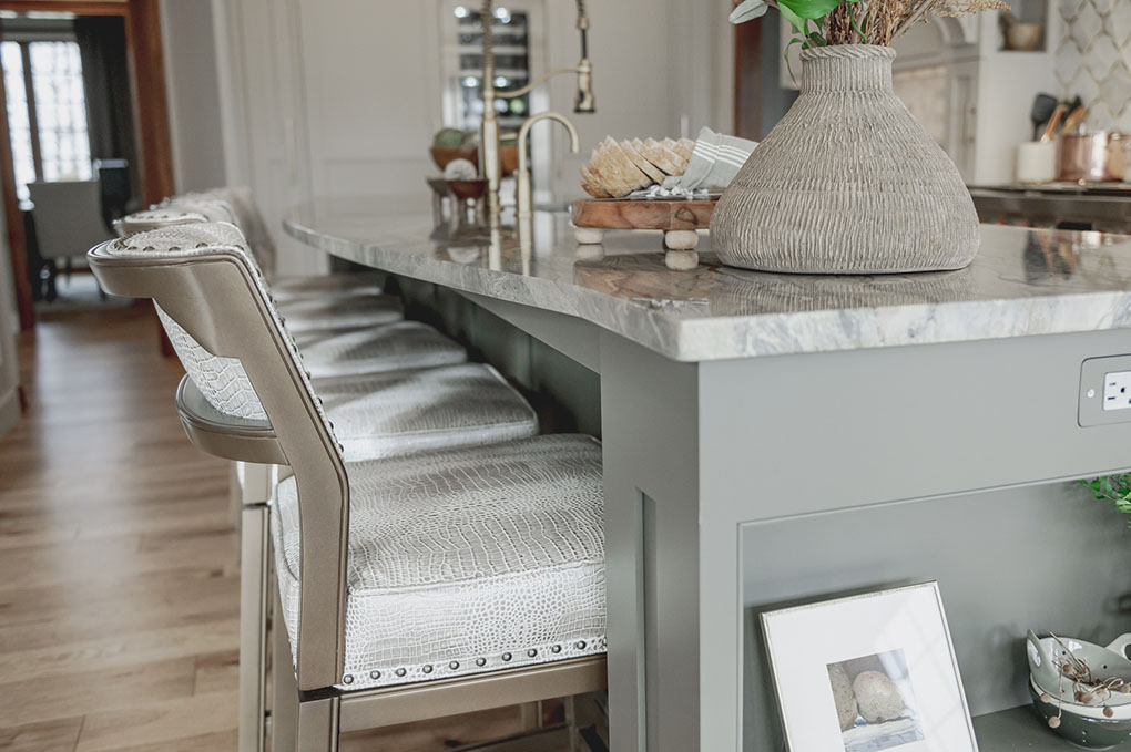 Kellyann incorporated beautiful quartzite countertops to accentuate the warm white and green/gray tones of the cabinetry, bringing a warmth into the once dark and dated space. By removing the desk and reconfiguring the island to accommodate entertaining, the kitchen was transformed into an inviting area full of warm gold tones, natural textures and on-trend yet timeless details.