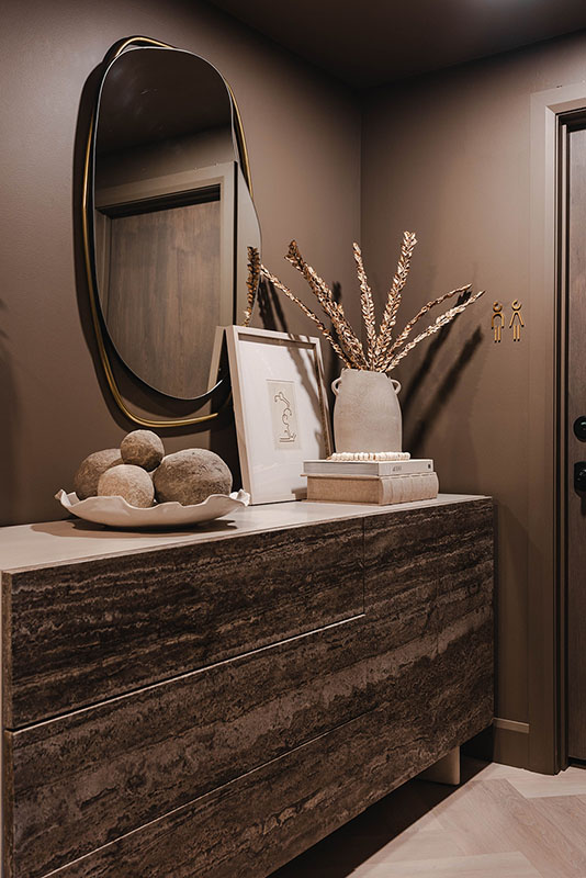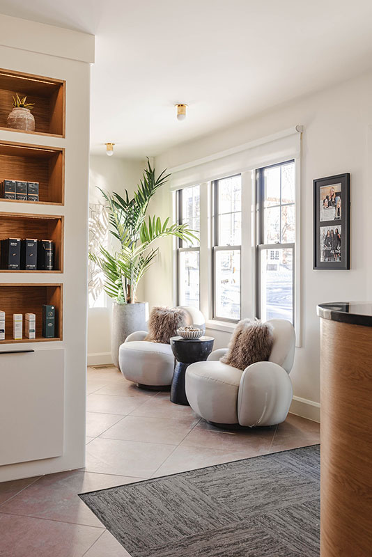 Audria and Kellyann designed a welcoming entrance space marrying organic luxury with modern wellness. Earth-toned neutrals and natural textures ground the environment, creating a calm, inviting atmosphere, while architectural design elements add a curated edge to the space. Their goal was to create a serene sanctuary that is both clean, comforting and unapologetically chic at the same time.