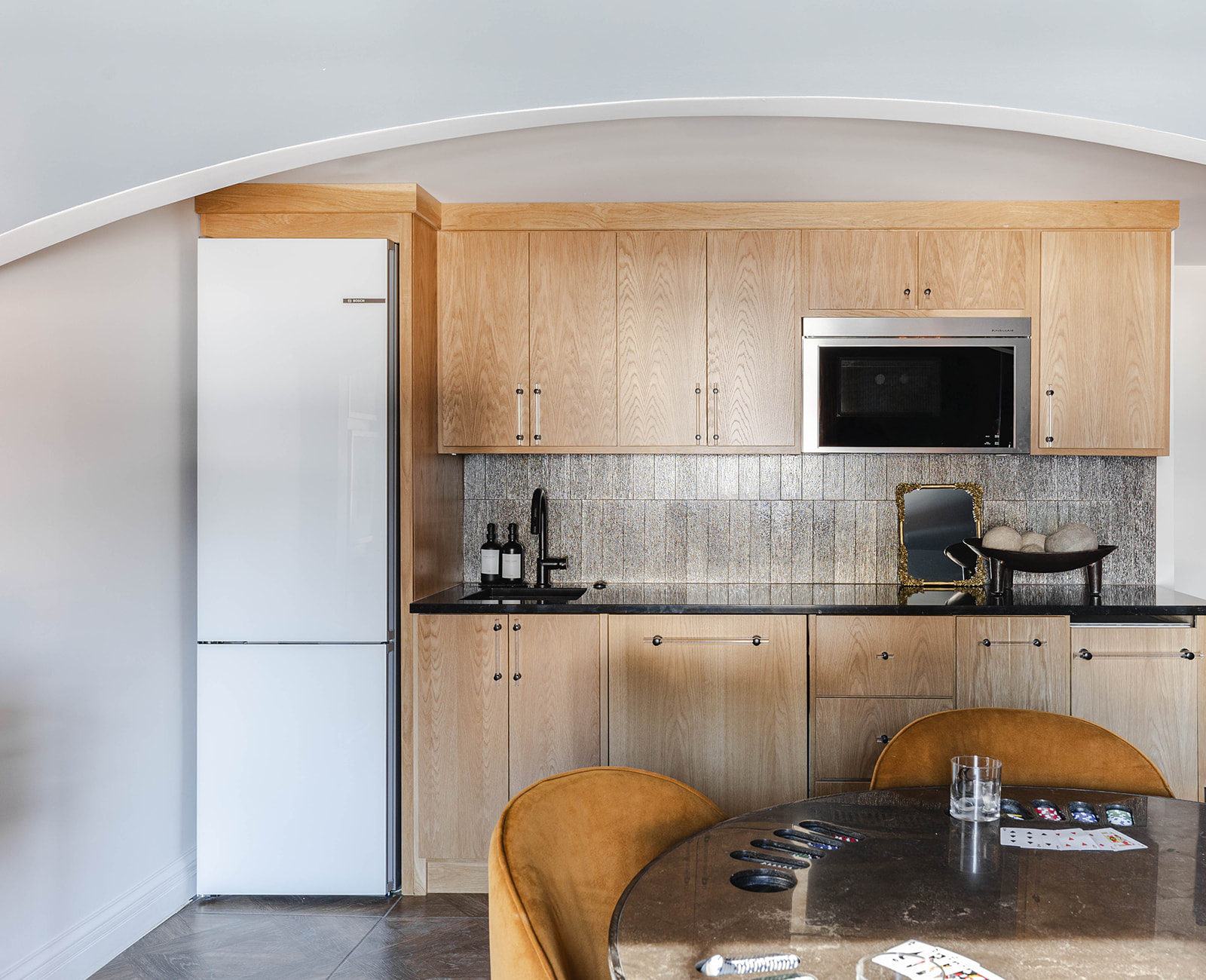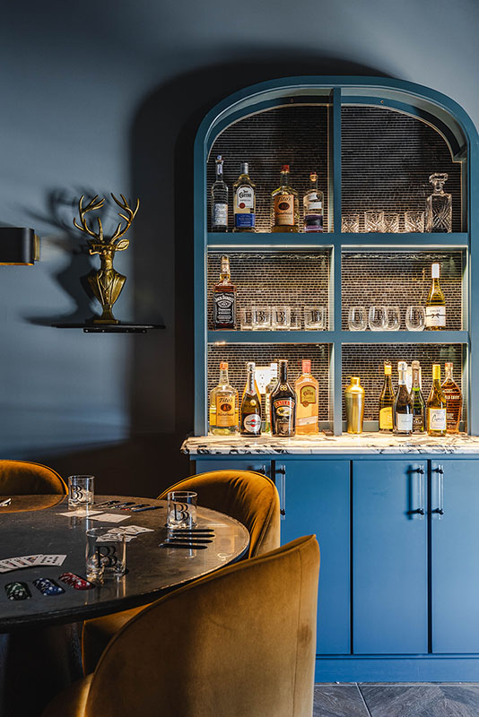 This space channels the allure of a modern speakeasy- moody, magnetic, and richly layered. Deep blue walls set a monochromatic tone and lux, brass accents elevate the design. At the center, a custom poker table anchors the room with a sense of occasion and rebellion. Modern, sculptural furnishings round out the design.