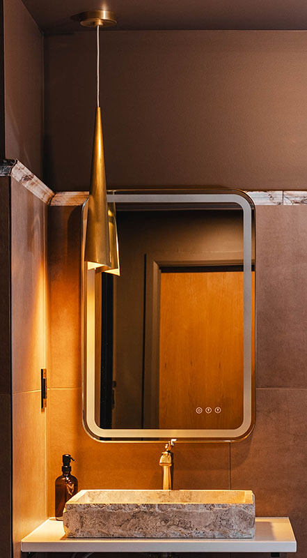 A study in contrast and allure, this luxurious commercial bathroom wraps visitors in a rich, moody atmosphere. The marble checkerboard floor provides classic design while a sculpted travertine sink adds earthy sophistication. This isn’t just a bathroom- it’s a statement in stone, metal and mood.