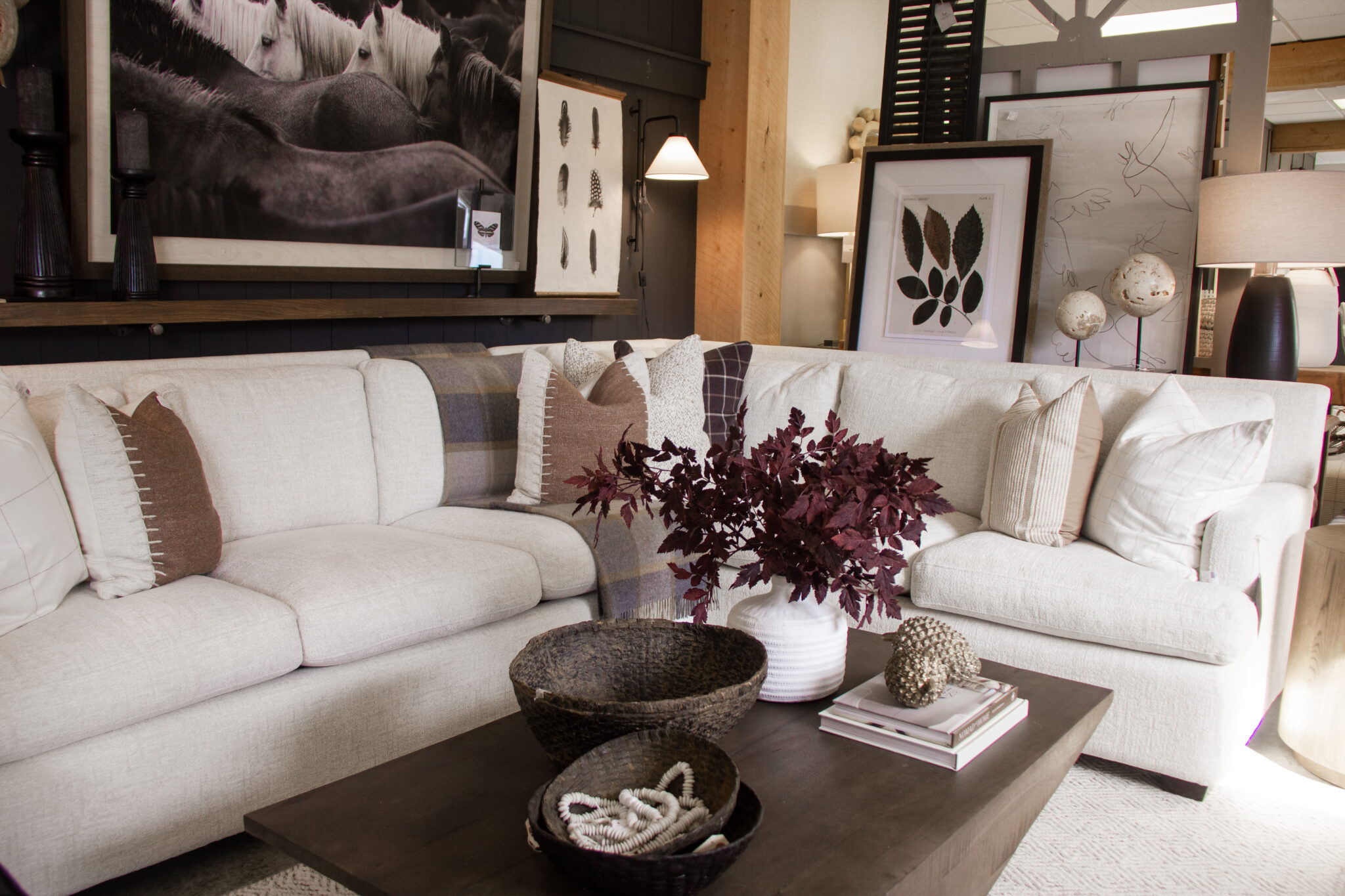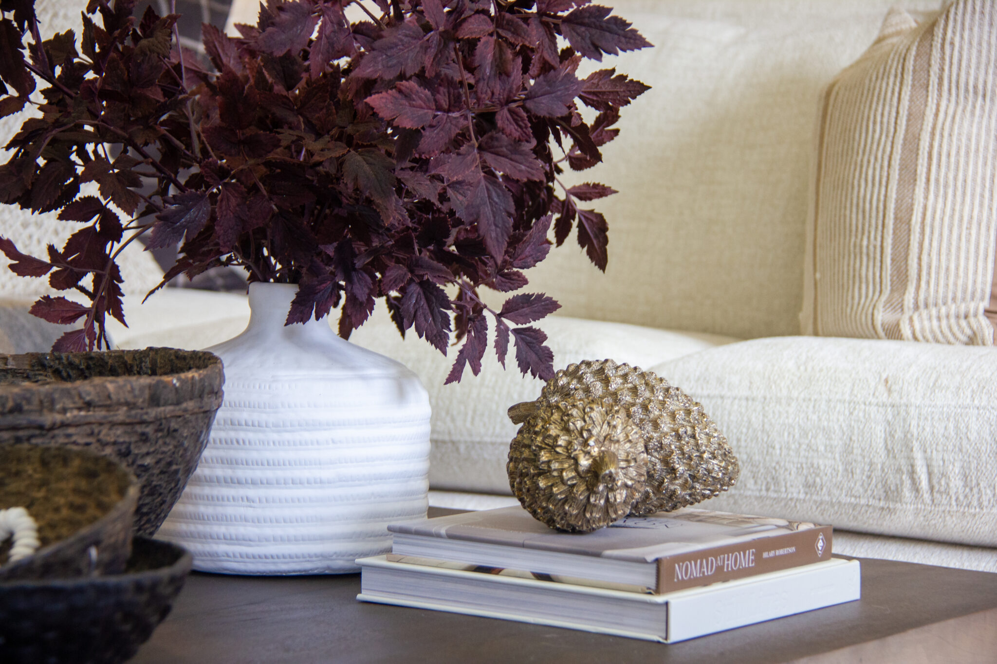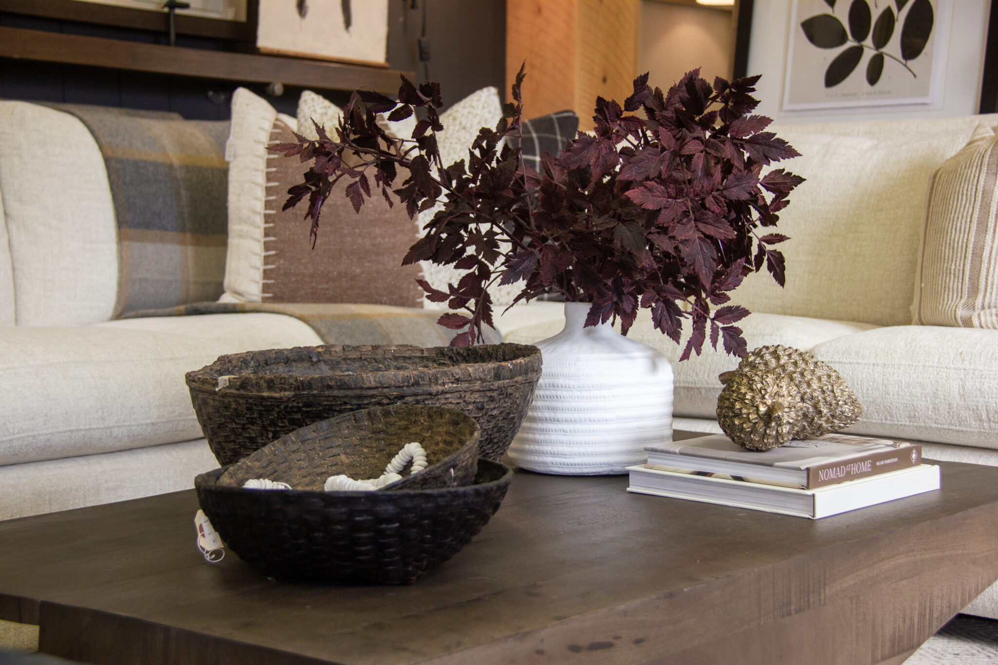 Styling for the holidays doesn’t just have to mean setting up your seasonal decor of orange pumpkin pillows and evergreen wreaths and looking like every other home on the block — there are many design details that can go into styling and personalizing your home for the holidays. Amy, our Showroom Manager, styled a space in our showroom for the spring/summer as well as the fall/winter so that you can see how a designer transforms a space for the seasons — and we’re giving you all the details to create your own cozy and seasonal spaces that make you want to curl up under a fur blanket by the fire with a book in one hand and a warm mug of hot cocoa and marshmallows in another. We’ll even include a bonus tip at the end that you won’t want to miss!