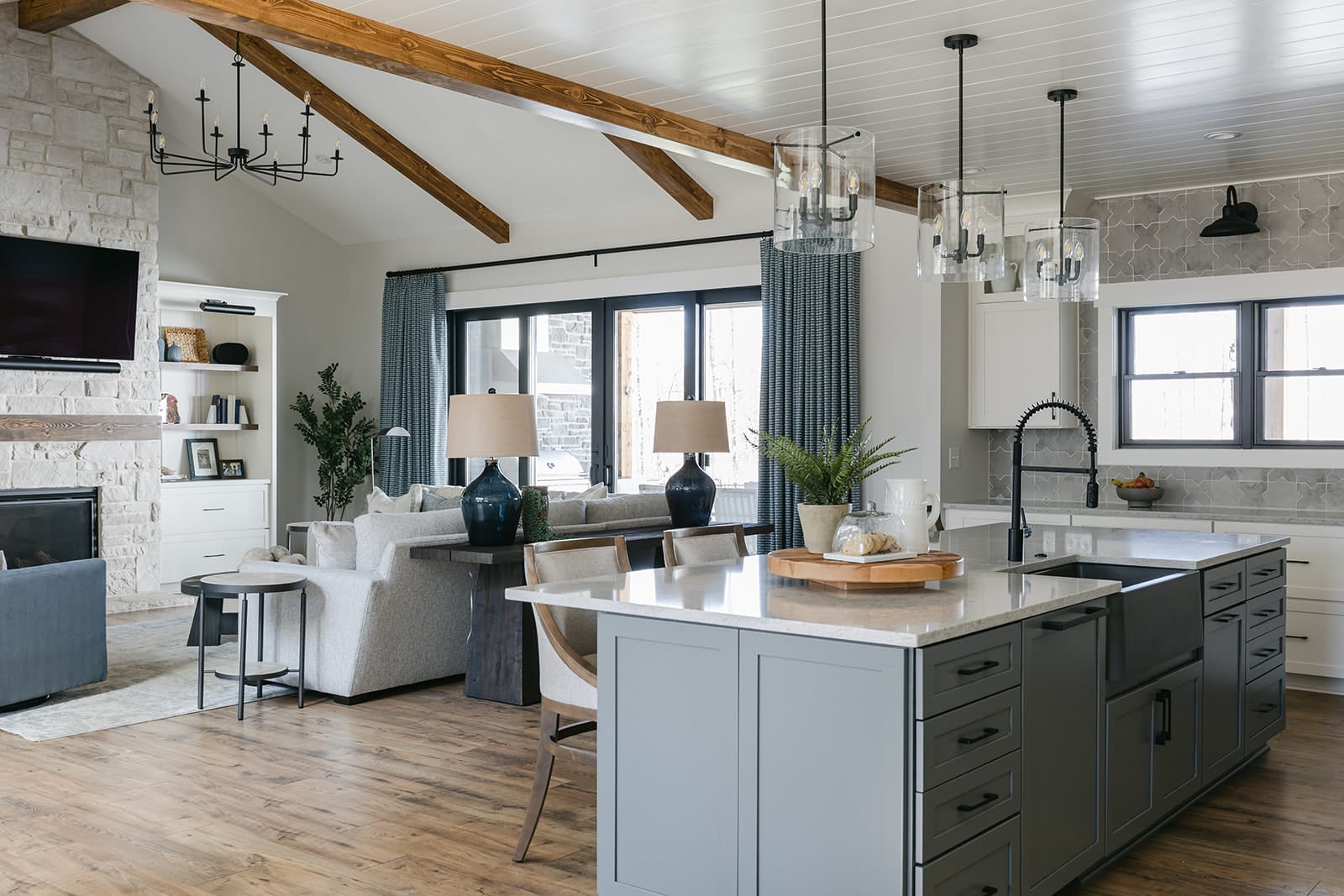 The main living space deserved a striking centerpiece. Floor-to-ceiling stone on the fireplace and rustic beams overhead add warmth and texture, while oversized lighting ties the room together. It’s a cozy, elegant space designed for gathering.